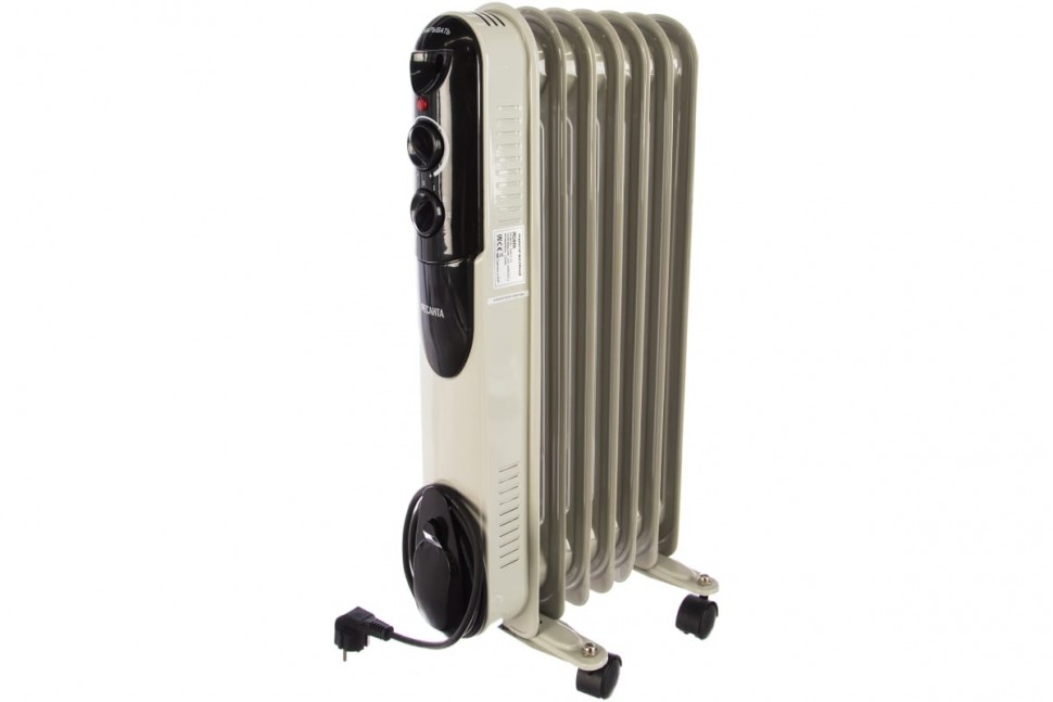 Масляный радиатор РЕСАНТА ОМПТ-7Н предназначен для обогрева воздуха и создания комфортной атмосферы в холодное время года. В металлическом корпусе находится масло, нагреваемое до высокой температуры при помощи нагревательного элемента. Далее радиатор отдает тепло помещению. Масляный радиатор оснащен термостатом, что позволяет ему автоматически поддерживать в помещении заданную пользователем температуру. Существенным плюсом является и то, что он обладает низкой температурой корпуса, благодаря чему практически не выжигает кислород в помещении.
