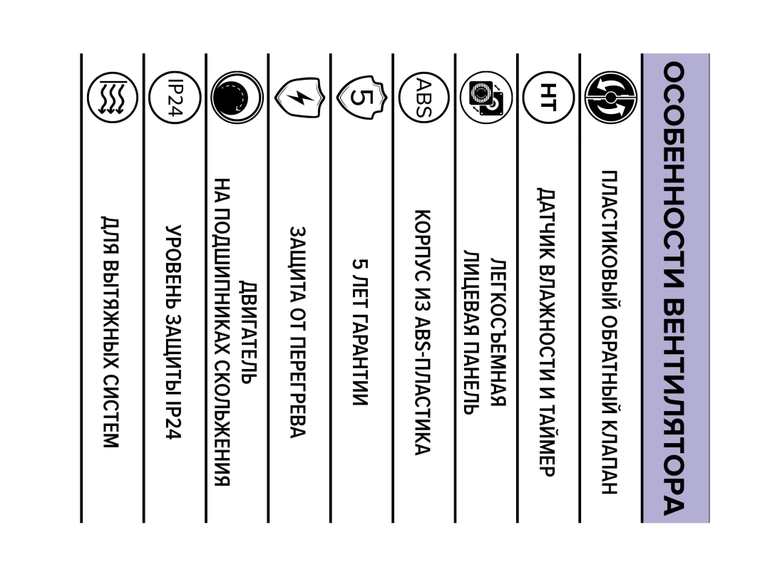 Корпус выполнен из высококачественного и прочного ABS-пластика, который надежно прослужит весь срок использования и не пожелтеет. Монтажный шаблон помогает отметить место для крепления вентилятора. Монтаж осуществляется с помощью саморезов.